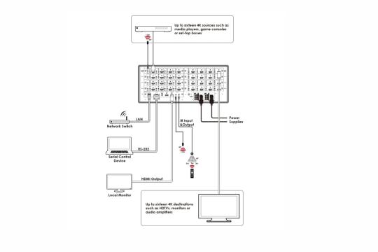 - Порты для входных и выходных плат поддерживают передачу 4К UHD с HDR и полосой пропускания 18 Гбит/с (600 МГц);